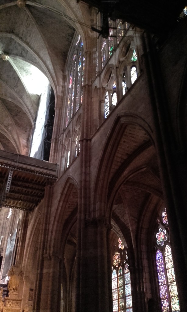 Gothic architecture evolved from Romanesque during the twelfth century and is easily recognizable by its pointed arches. These were combined with rib vaults (ceilings with crisscrossing ribs between the arches) to produce an architecture with a whole new set of possibilities. Ceilings could be lighter, and buildings could be made taller without the use of enormous volumes of stone. Most spectacularly from an aesthetic point of view are the windows — the greatest gift of austere Gothic architecture is light! A window is a structurally weak point in a wall, but in Gothic buildings the walls could be made much lighter and windows broken through with greater ease. There is no better example of this on the Camino than the cathedral of León, where its beautiful stained-glass windows flood you with inspiring colour. When Pope John XXIII visited, he was said to exclaim in admiration, “This Cathedral has more glass than stone, more light than glass and more faith than light!”[1] I can’t imagine a more perfect tribute to its builders.