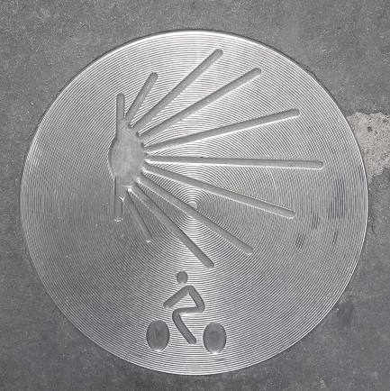 As you walk through Pamplona, you are guided along the Camino by the usual yellow arrows and occasional blue sign, but also by a series of shiny aluminum discs embedded in the pavements, with an engraved shell-star and a little biker symbol (I’ll confess that it was probably my third visit to Pamplona when I had that eureka moment and recognised it was meant to be someone on a bike!). But along the streets of the old part of the city you’ll also find small square gold plaques, bolted on the ground by various doorways. Quite at random, I took a picture of one of these on the Calle Mayor. In Euskera (Basque) and Spanish, it reads: