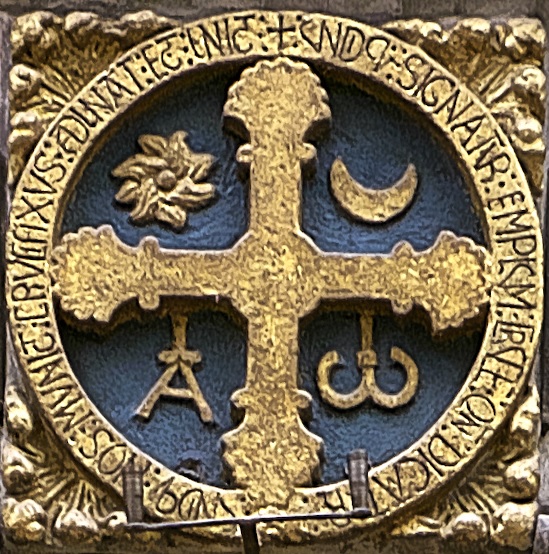 By the eleventh century, the rite of consecrating a cathedral (dedicating it as a place of worship) had become quite complex, and part of it included the presiding bishop anointing the interior of the building, by marking a cross with chrism (holy oil) twelve times on the walls.[1] This act was often memorialised in paint or stone, as in the case of the consecration of the cathedral of Santiago de Compostela by Archbishop Pedro Muñiz in 1211AD — 136 years after construction began. Cathedral-competitive Catalans might point out that even the Sagrada Família in Barcelona reached this point quicker, as it was consecrated by Pope Benedict XVI in 2010, 128 years after the foundation stone was laid. However, Galicians might retort that at least theirs was finished.