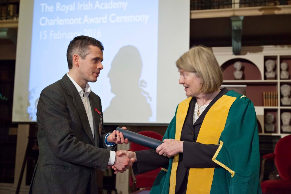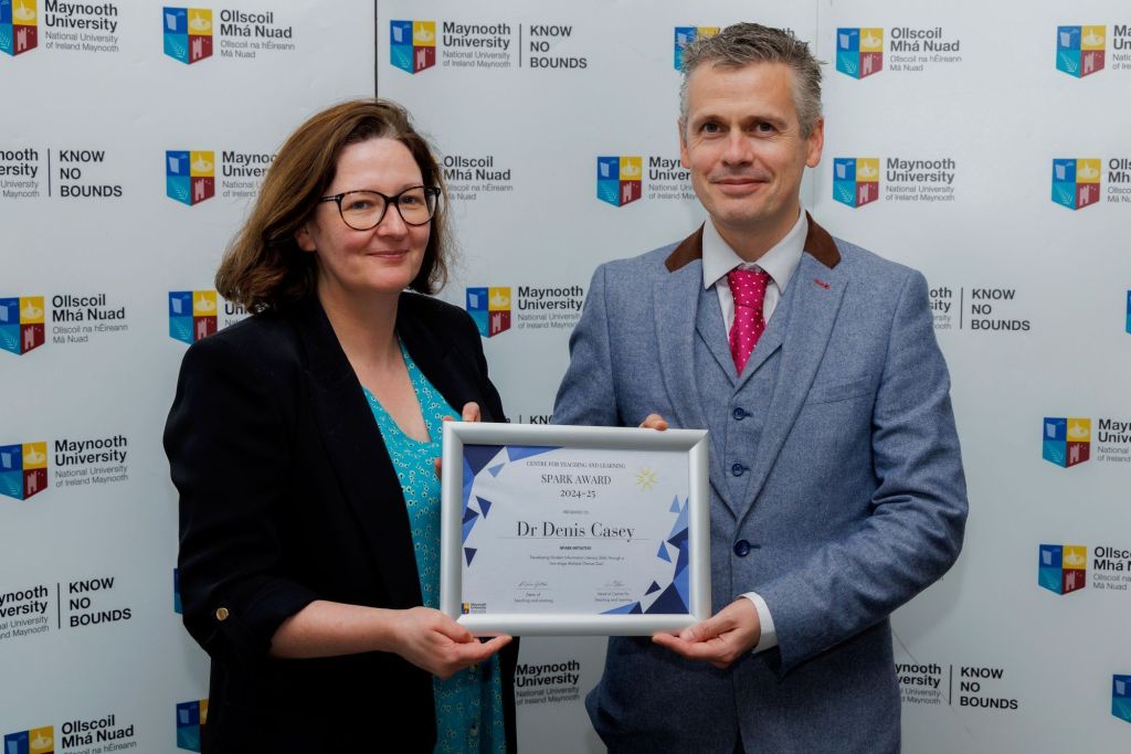 Left: Receiving a Charlemont Award from Prof. Mary Daly, President of the Royal Irish Academy (2016). Right: Receiving a SPARK teaching award from Lisa O’Regan, Head of the Centre for Teaching and Learning, Maynooth University (2024).
